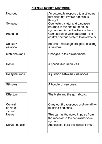 Classwork and Homework Handouts - Penfield analzying sensory somatic responces - system reinforcemnt worksheet (doc 15 kb) concept mapping the nervous system worksheet (doc 12 kb) nervous system reinforcement worksheet (doc 666 kb) nervous system worksheet (doc 42 kb) organization of the nervous system worksheet (doc 61 kb) spinal cord & reflex act worksheet (doc 5.30 mb) structure of the … Neuroscience for Kids - Worksheets - University of Washington These pages contain worksheets and lessons that are ready for you to print out and work on off-line. Just click on a worksheet, print it out and get to work. ... Divisions of the Nervous System; Brain Rhyme Time Worksheet; Explore the Neuroscience for Kids Web Site | "Throw it Out" (The Senses) ... Back to School - 2; Back to School - 3; Happy ... Nervous System - Katie Hall - Laurens County Schools Nervous System Vocab Quizlet ... Use this video to complete the worksheet ... Webquest" If it doesn't work, google the questions to find the answers.