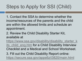 Child Disability Starter Kit - Social Security Administration The fact sheet answers frequently asked questions about applying for SSI child disability benefits. It includes the definition of disability for children under age 18, information about the SSI program, and other important information about state and local medical assistance. It provides a link to the online Child Disability Report.